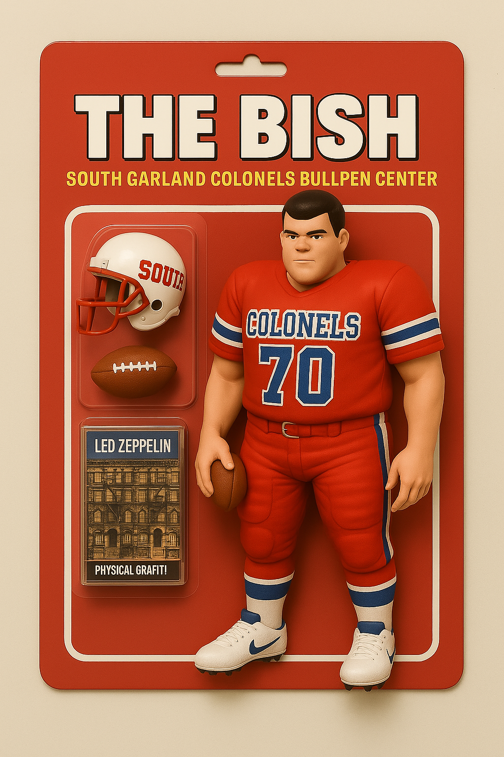 Who wants high school football action figure of The Bish? When I was in high school, it was football and Led Zeppelin, and that was pretty much it. It’s still shocking to see how small the pads they use now are compared to the ones we used in the 80s.