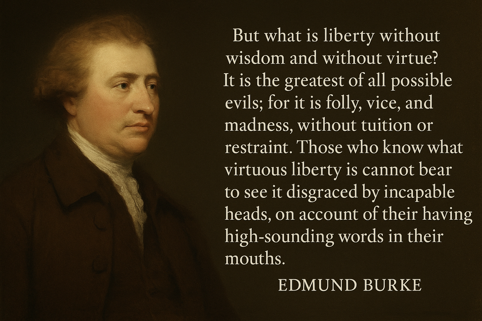 But what is liberty without wisdom and without virtue? It is the greatest of all possible evils; for it is folly, vice, and madness, without tuition or restraint. Those who know what virtuous liberty is cannot bear to see it disgraced by incapable heads, on account of their having high-sounding words in their mouths.